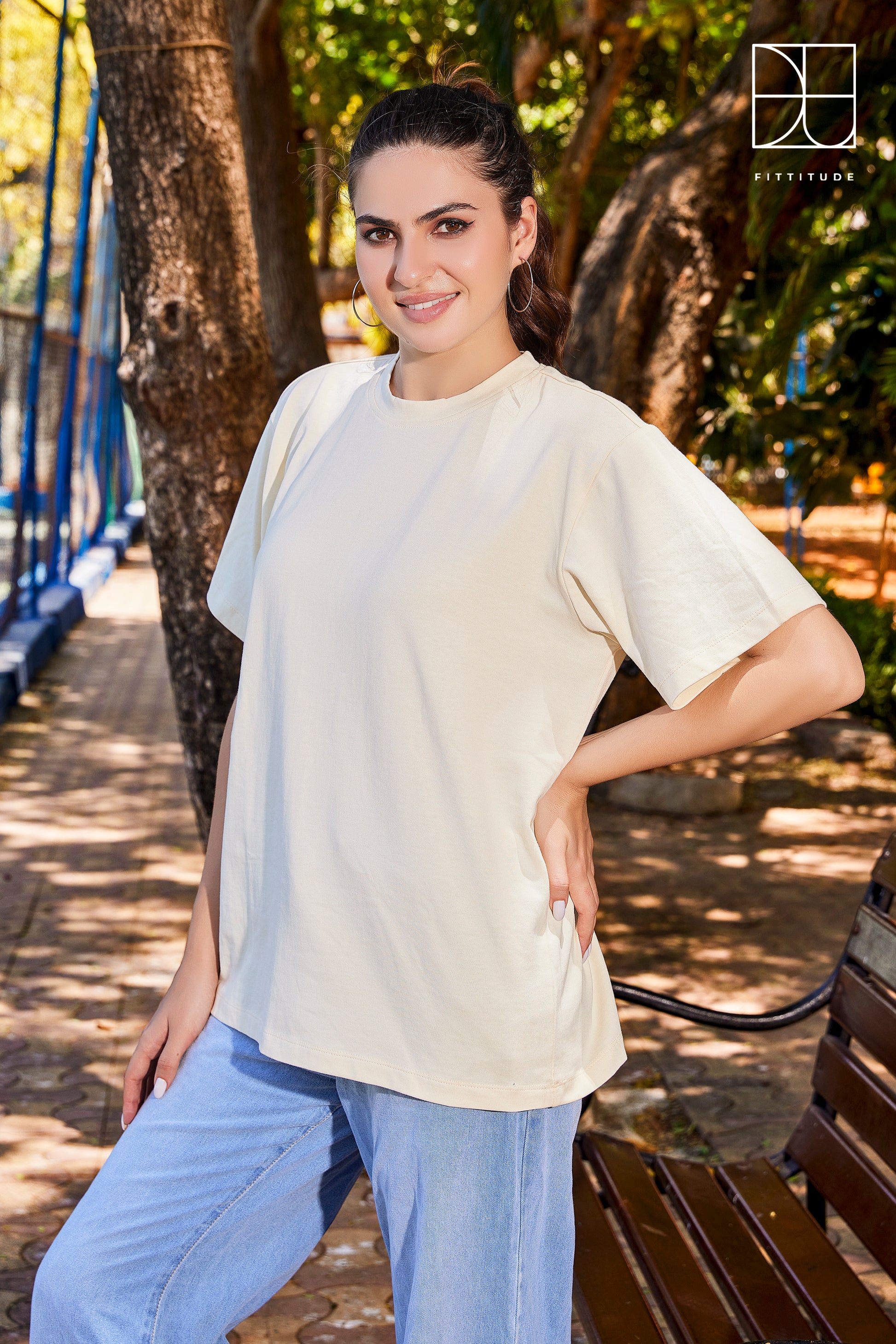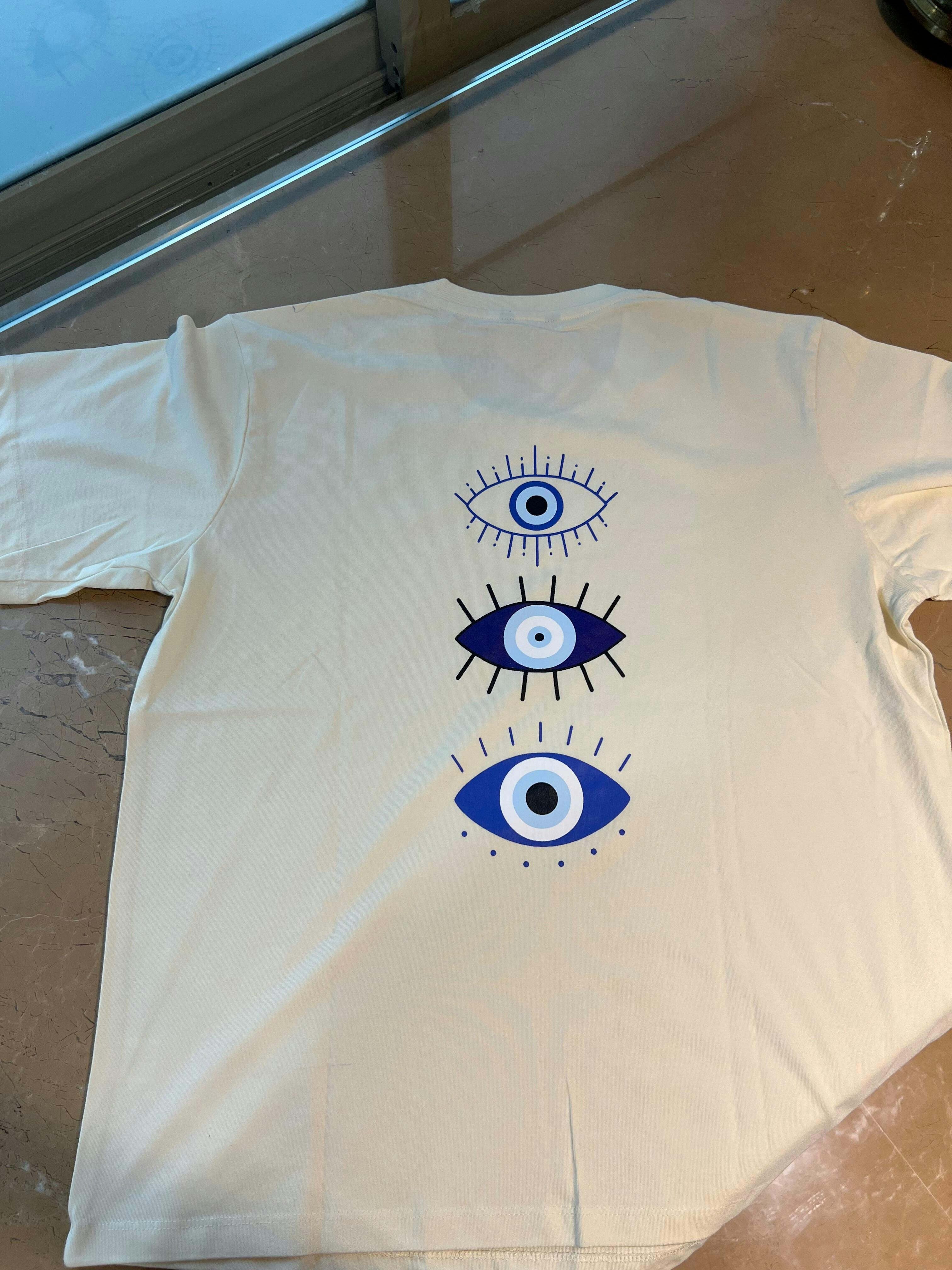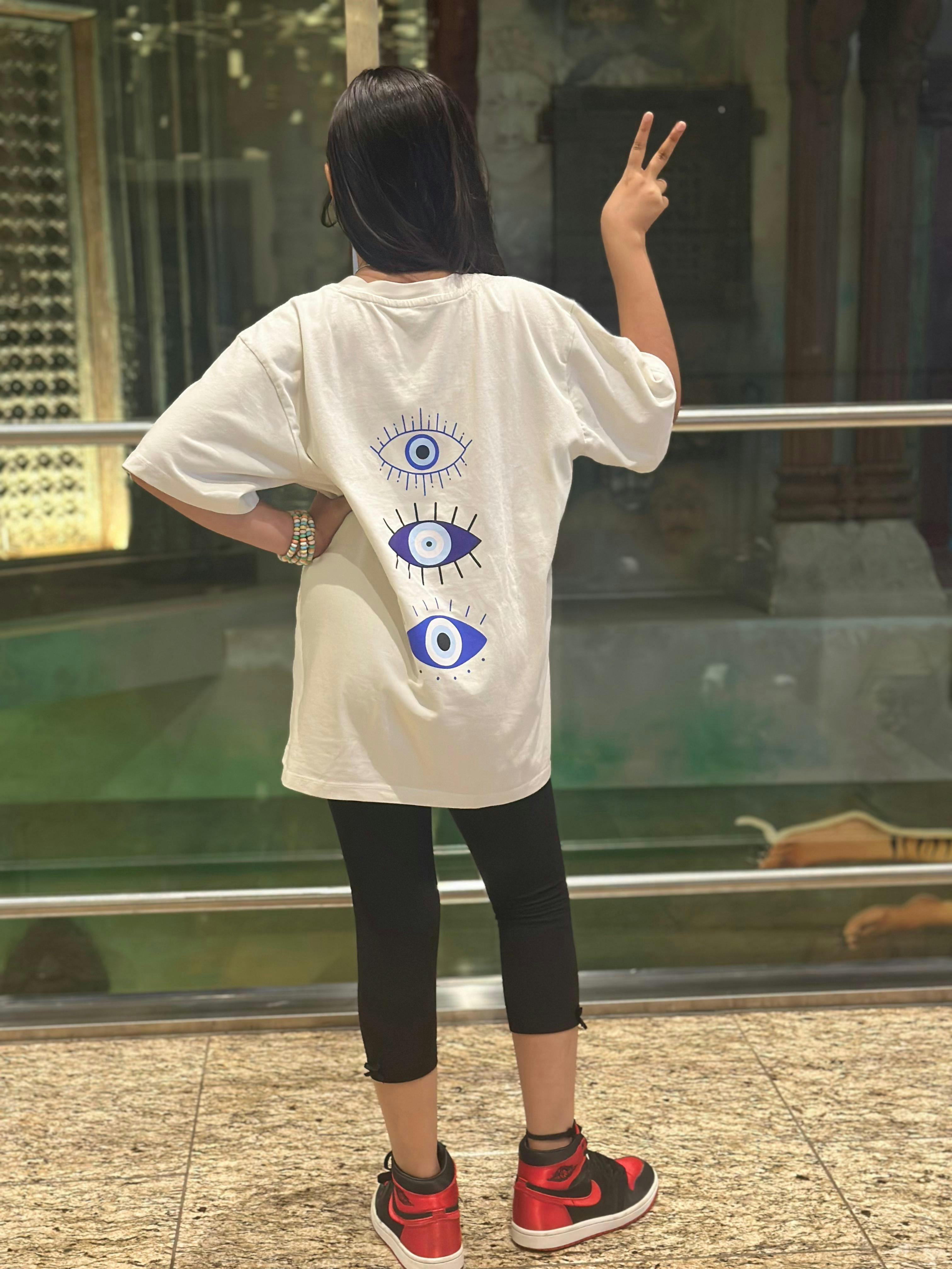 Stay effortlessly cool and stylish with this ivory oversized T-shirt. Crafted from soft, breathable fabric, this T-shirt features a striking back print with the evil eye. The relaxed fit ensures maximum comfort, making it perfect for everyday wear. Pair it with your favorite jeans or shorts for a laid-back yet fashionable outfit.