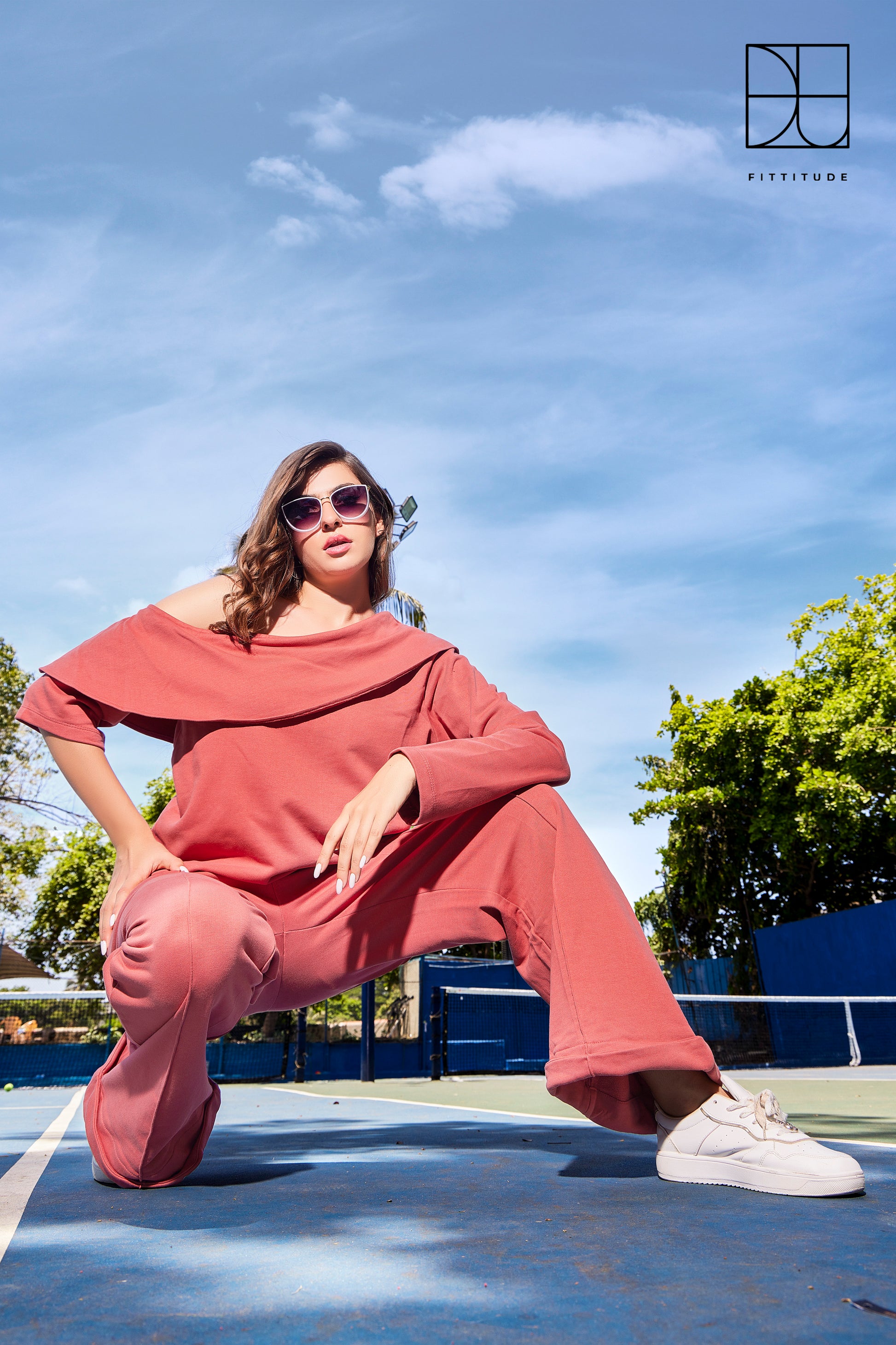 Elevate your casual wardrobe with this classy rust coord set. Featuring a stylish off-shoulder top with a unique layered neckline, paired with wide-leg pants for ultimate comfort, this ensemble is perfect for both lounging and casual outings. The rich terracotta hue adds a warm, trendy touch, while the soft, breathable fabric ensures all-day ease. Complete with practical side pockets and a relaxed fit, this coord set is the ideal blend of fashion and function. Pair it with your favorite sneakers and sunglasses for an effortlessly stylish look.