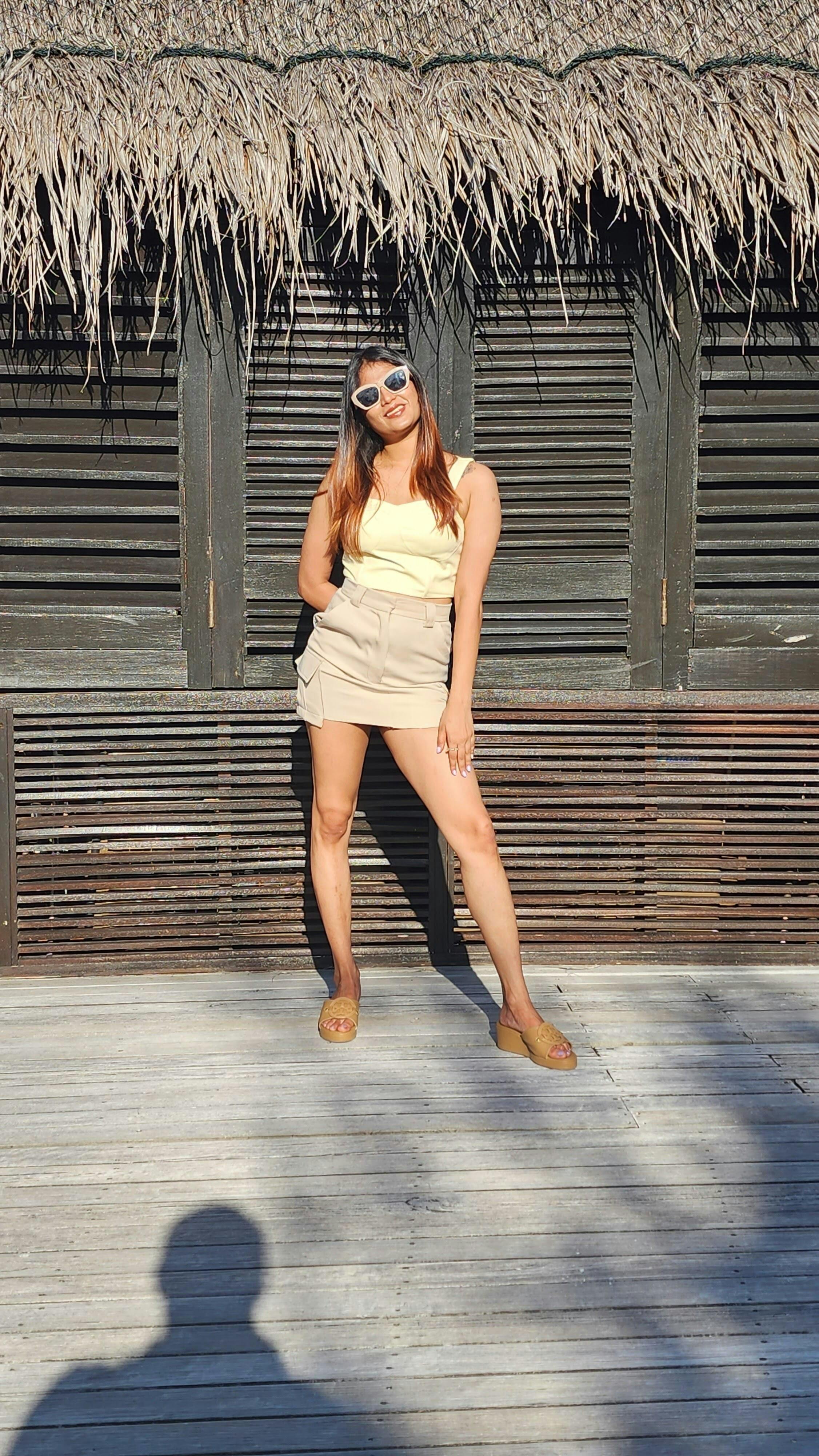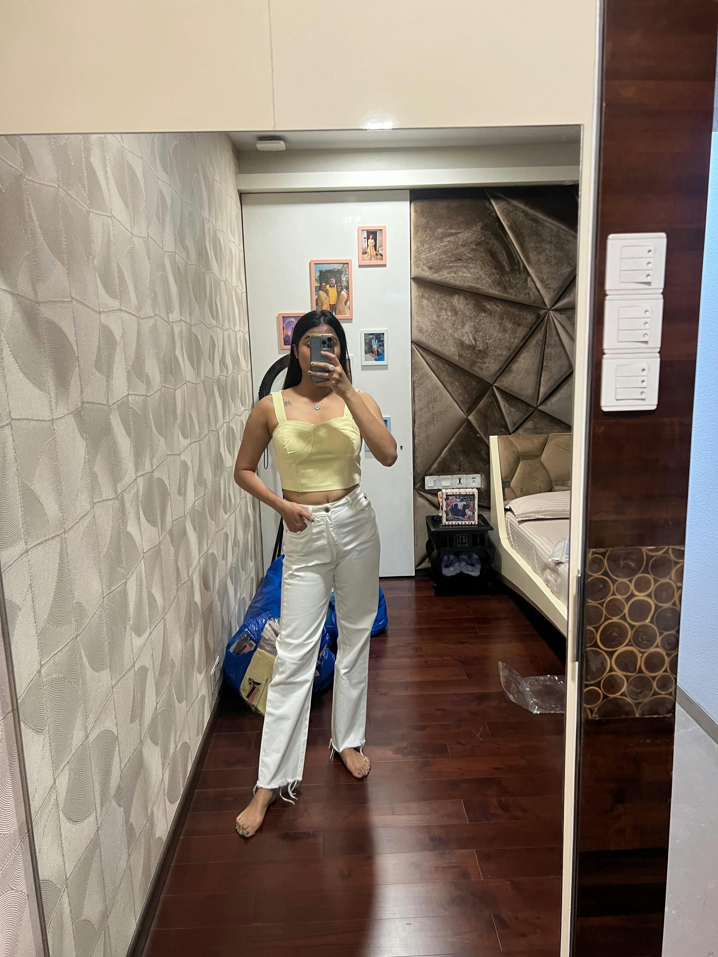 Elevate your style with this chic crop top and skirt coord set. The pastel yellow crop top features a structured fit with wide shoulder straps and subtle seam detailing, offering a sophisticated yet trendy look. Paired with a matching high-waisted skirt, this set is accentuated by a stylish belt and a contrasting hemline, creating a striking visual appeal. Perfect for both daytime outings and evening events, this coord set effortlessly combines comfort and elegance. Pair with your favourite boots or heels to complete the look.